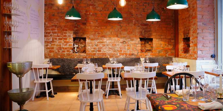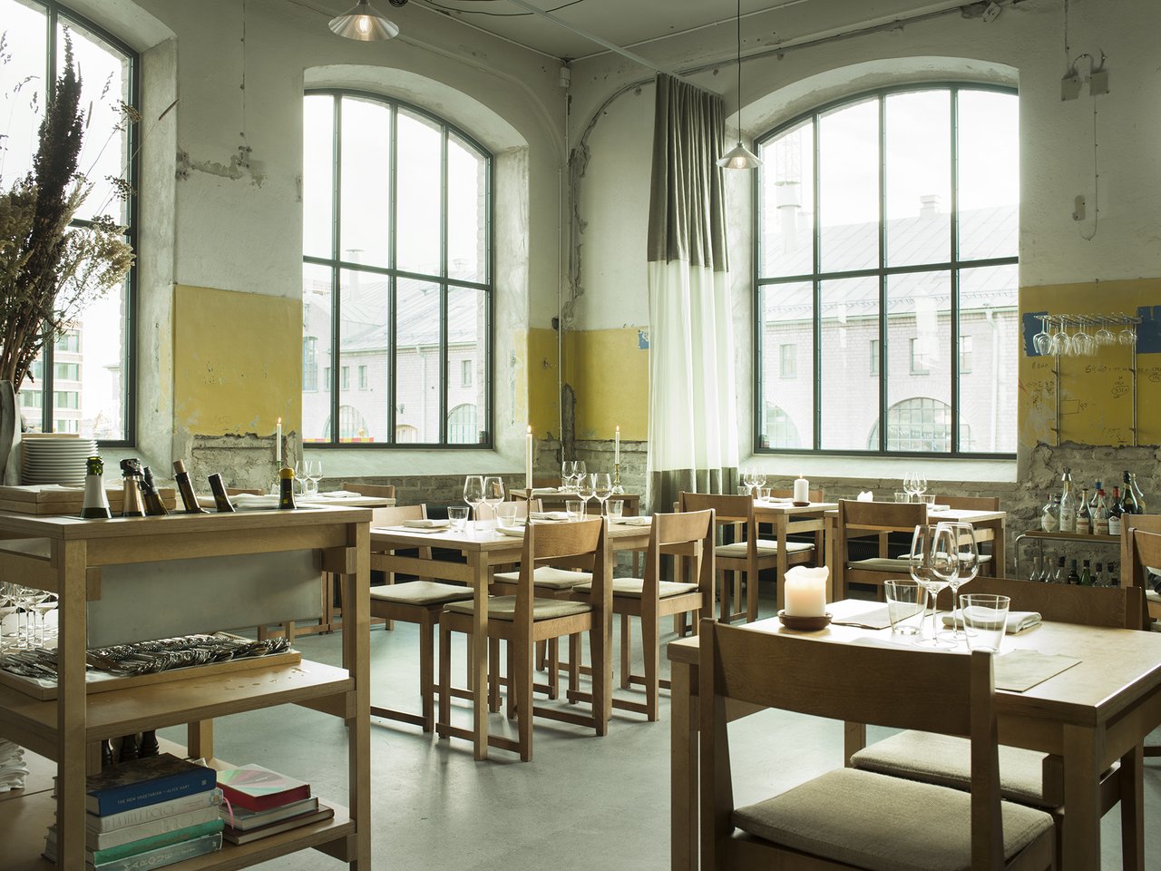 "embeddedTextCaption": "A bright restaurant space with large arched windows, simple wooden tables and chairs, and set tables in a raw, industrial-style interior.",
