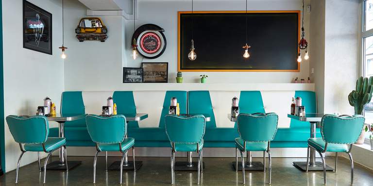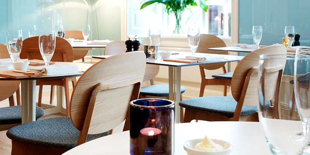 "alt": ": A bright dining room with light blue walls and typical Scandinavian minimalist- design furniture. Little tea lights are placed on each table."
