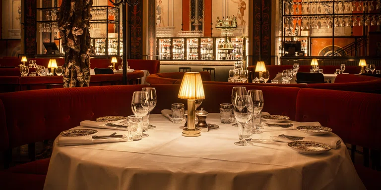 "alt": "The dark interiors and brown hues at Mäster Anders restaurant in Kungsholmen. A long leather sofa runs along one of the brick walls and the light fixtures are hanging low."