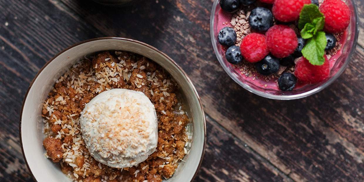 "caption": "Two bowls of desserts from Magnolia, one with a scoop of ice cream sprinkled with coconut flakes and one with fresh blueberries and strawberries.",