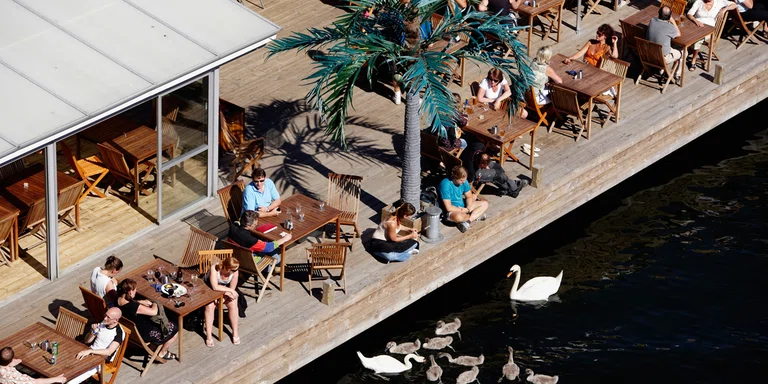 "alt": "A view over the jetty and outdoor restaurant Mälarpaviljongen at Norr Mälarstrand in Stockholm. The restaurant is located both on land and out on the water.",