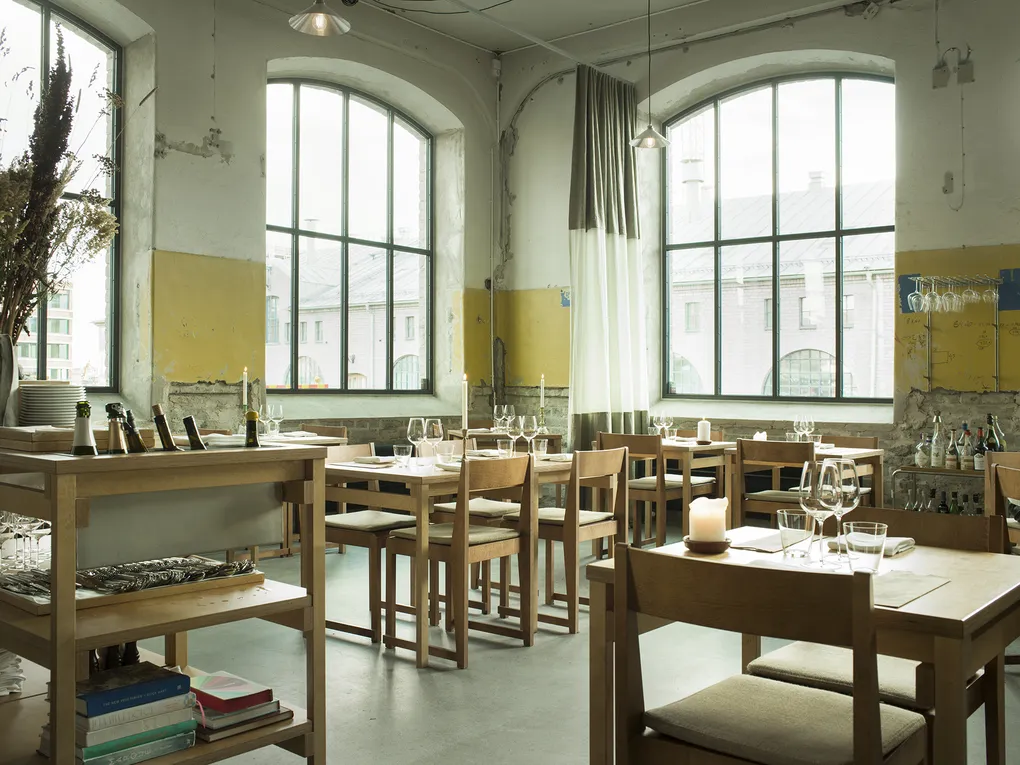 "alt": "A bright restaurant space with large arched windows, simple wooden tables and chairs, and set tables in a raw, industrial-style interior.",