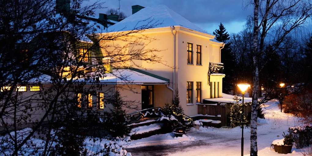 "embeddedTextCaption": "The exterior of the restaurant and inn, Långbro Värdshus in wintertime. A beautiful white building that looks like a private residence is covered with snow.",