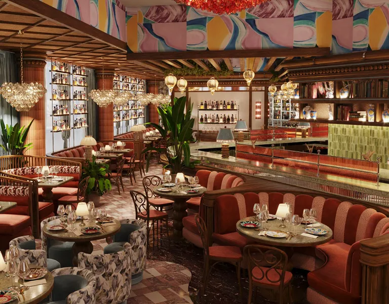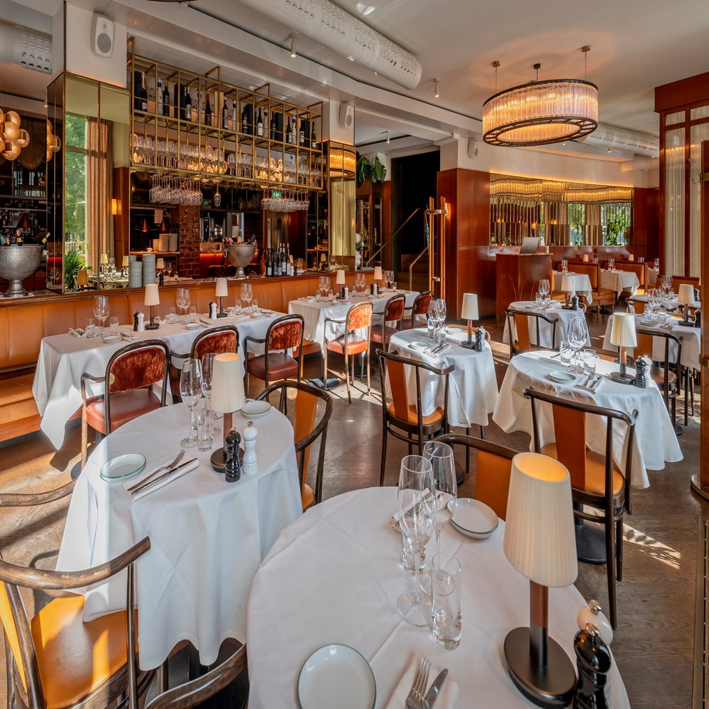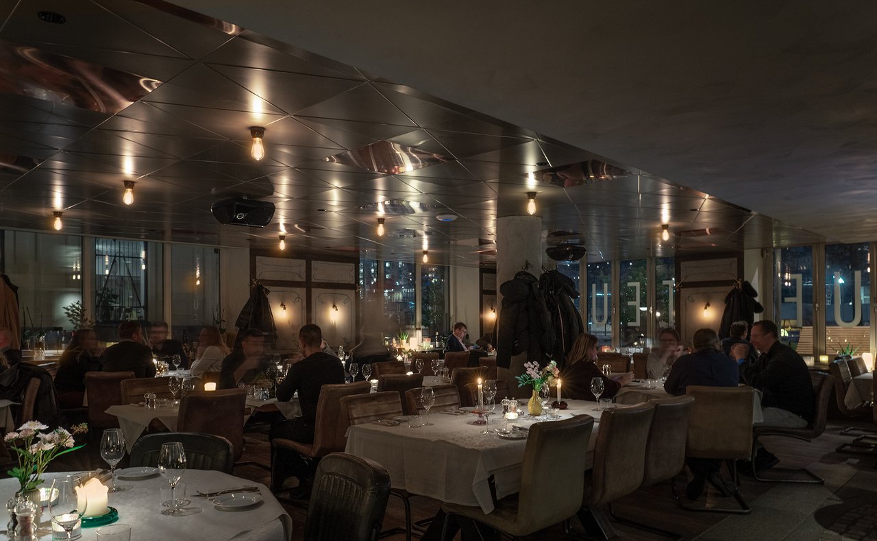 "embeddedTextCaption": "An atmospheric evening dining room with white tablecloths, soft leather chairs, candlelit tables, and warm lighting reflected in a metal-paneled ceiling.",