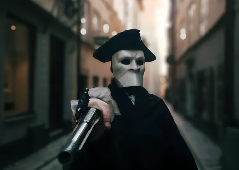 "embeddedTextCaption": "A person in historical clothing with a cloak and tricorn hat stands in a narrow city street, aiming an old-style firearm toward the camera. The face is hidden behind a white mask, creating a tense and dramatic mood.",