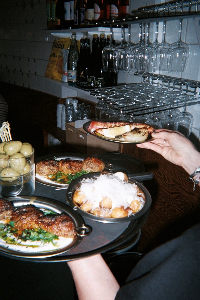 "embeddedTextCaption": "A server carries a tray with several small dishes – meat, potatoes topped with grated cheese and grilled bread – in front of a bar lined with wine glasses, bottles and a glass filled with olives.",