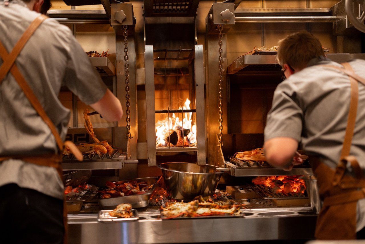 "embeddedTextCaption": "Two chefs working at an open wood-fired grill, cooking seafood and other dishes over glowing embers.",