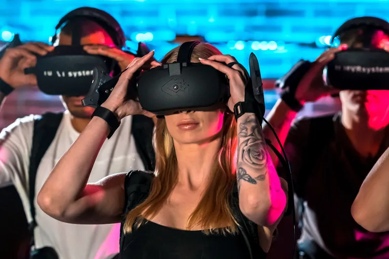 "embeddedTextCaption": "People playing together with VR headsets in a brightly lit indoor environment, with one person in focus adjusting their headset.",