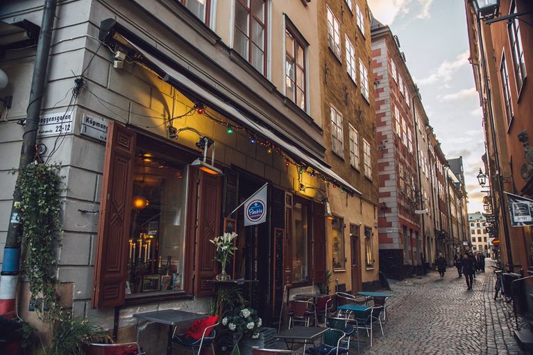 "embeddedTextCaption": "A restaurant façade in Stockholm’s Old Town with open wooden shutters, small outdoor tables along a narrow cobblestone street, and historic buildings in warm tones.",