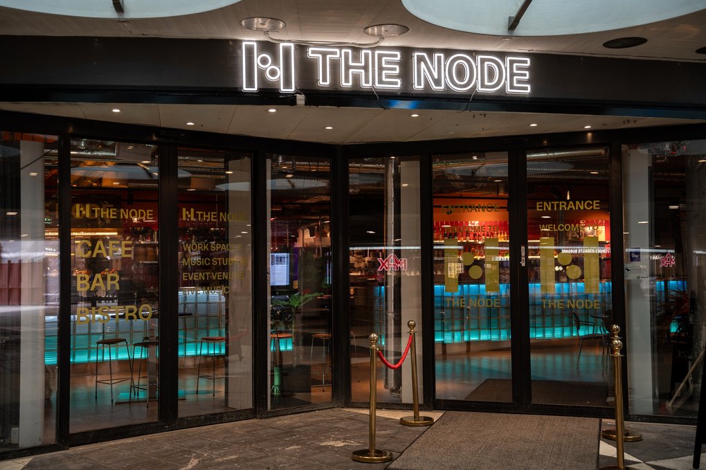 "alt": "Entrance to The Node with glass doors and a neon sign above; inside, a bar and seating area with turquoise lighting are visible.",