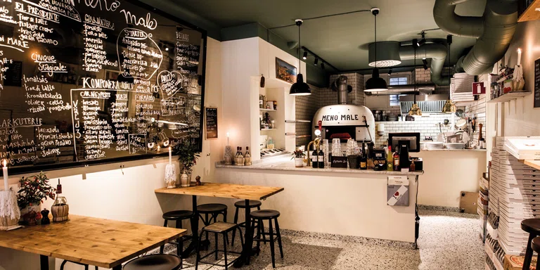 "alt": "A long wooden bench is lined up along the white wall, a woman is walking past, reading the menu. Framed photographs are visible behind her."