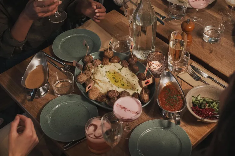 "embeddedTextCaption": "A wooden table set for dinner with a large bowl of meatballs arranged around mashed potatoes topped with melted butter, surrounded by sauces, pickled cucumbers, lingonberries, and cocktails in a warm, lively restaurant setting.",