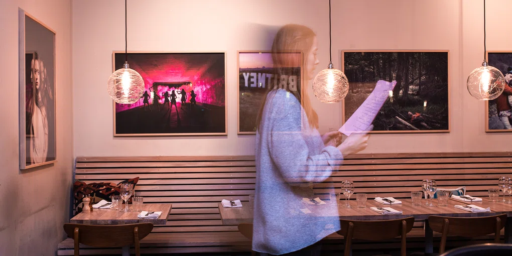 "embeddedTextCaption": "A long wooden bench is lined up along the white wall, a woman is walking past, reading the menu. Framed photographs are visible behind her.",