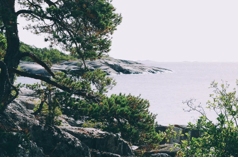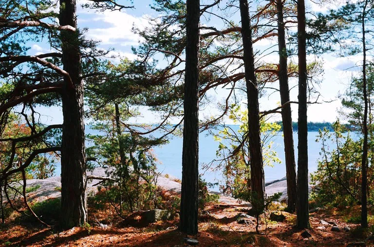 "alt": "Stockholms skärgård, sommar. Björnö naturreservat, sommar. En tät tallskog. Mellan träden syns Östersjöns blå vatten titta fram.",