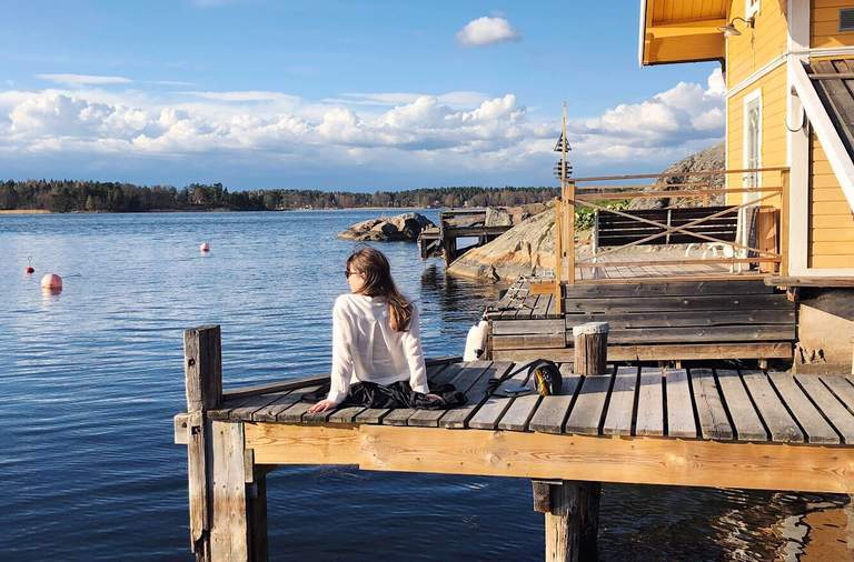 "embeddedTextCaption": "Stockholms skärgård. Sommar, solnedgång. En kvinna sitter och vilar på en brygga i Vaxholm.",