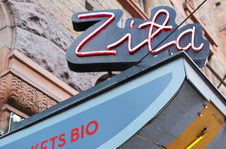 "alt": "Culture in Stockholm. Cinemas. The neon-sign in front of Zita. Zita is the oldest, still-running, cinema in Stockholm.",