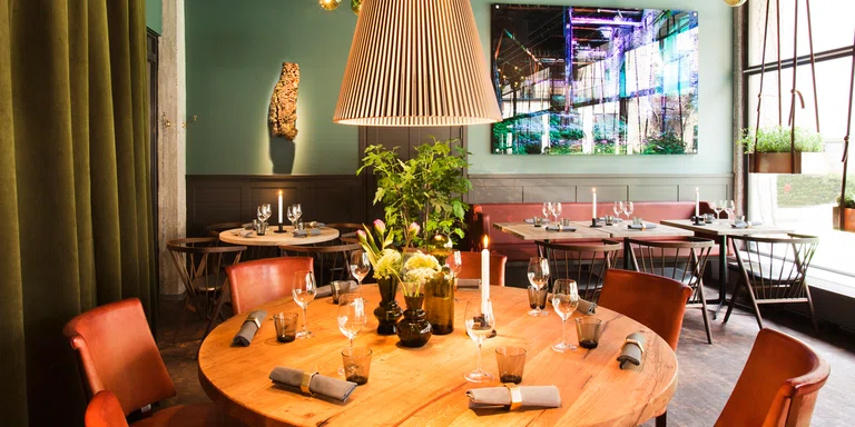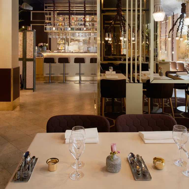 "alt": "An interior scheme with the colours white and deep burgundy. Tables are set for dinner and a bar is located in the back of the room. The atmosphere is a bit 1970´s with gold details and marble",