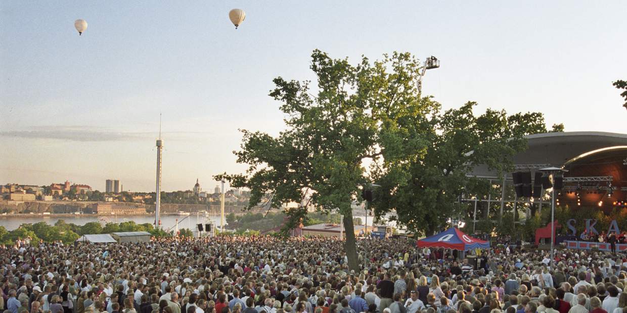 "alt": "A view over a sea of people visiting outdoor museum Skansen in Stockholm. Hot air ballons fill the summer skies. Famous landmarks are visible behind the crowds."