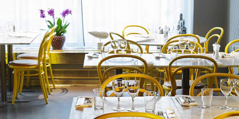 "alt": "A light room with smallish tables and bright, yellow chairs. The tables are set for dinner service and a pretty purple flower sits on the windowsill.",
