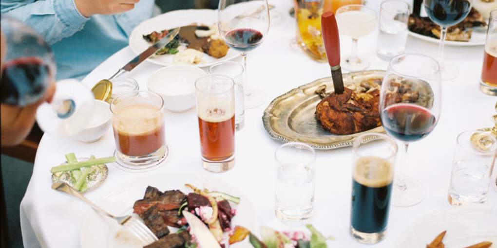 "embeddedTextCaption": "An overhead view of a round table set for sharing, with small plates, charcuterie, cheese, candlelight, and colorful drinks, as hands reach in to serve.",