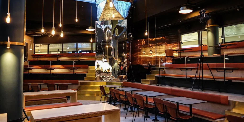 "alt": "Restaurant tables and chairs are set in the middle of the room, a mirror is fastened on a pillar and the room is surrounded by seats on stairs, like an outdoor theatre."