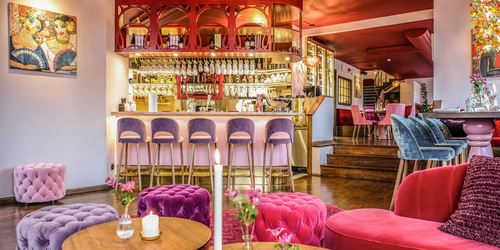 "embeddedTextCaption": "A large room dominated by purple and pink hues. The sofas, bar stools and chairs are all covered in velvet in soft colours. The tables are in a light wood and decorated with candles and small vases with a single flower.",