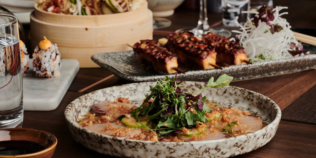 "embeddedTextCaption": "Asian-inspired fusion food served on marble plates.",