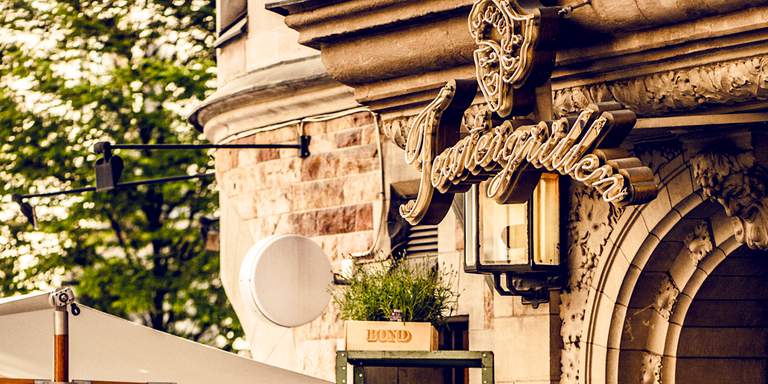 "caption": "The exterior of restaurant Teatergrillen, an old intricately decorated building in sandy beige bricks.",