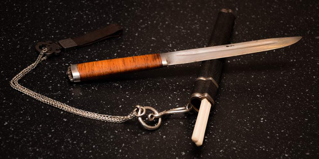 "alt": ": An image of a sharp knife in a leather case. A pair of eating sticks poke out of the case.",