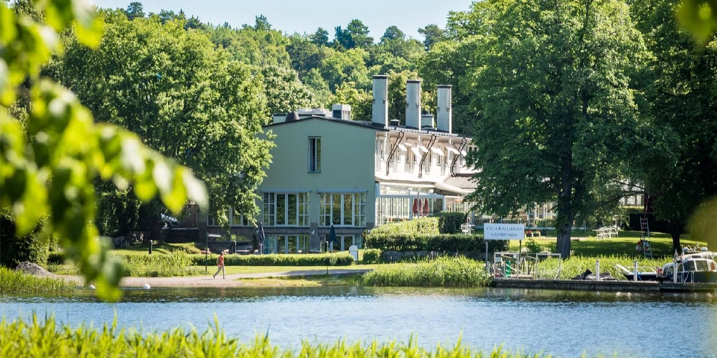 "embeddedTextCaption": "The exterior of hotel and restaurant Villa Källhagen in summer, view from the other side of the Djurgården canal.",