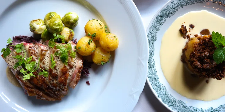 "alt": "A traditional Swedish dish from the classic Stockholm restaurant Tennstopet. Meat, small potatoes and sprouts all look very appetizing.",