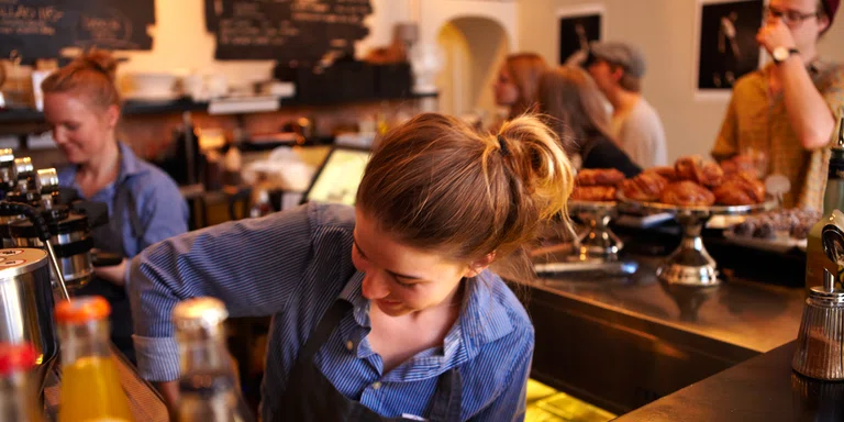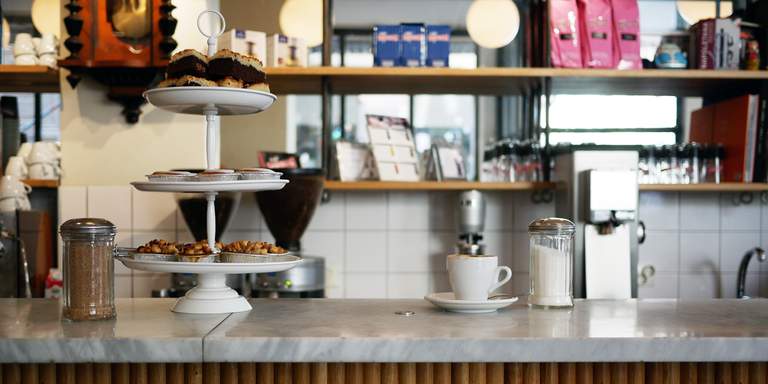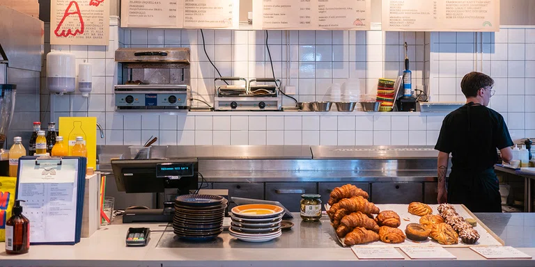 "alt": "Cafés in Stockholm. Lykke Kaffebar on Södermalm, interiör. A barista prepares coffe at Lykke. Cinamon buns a pastries are line up at the counter.",