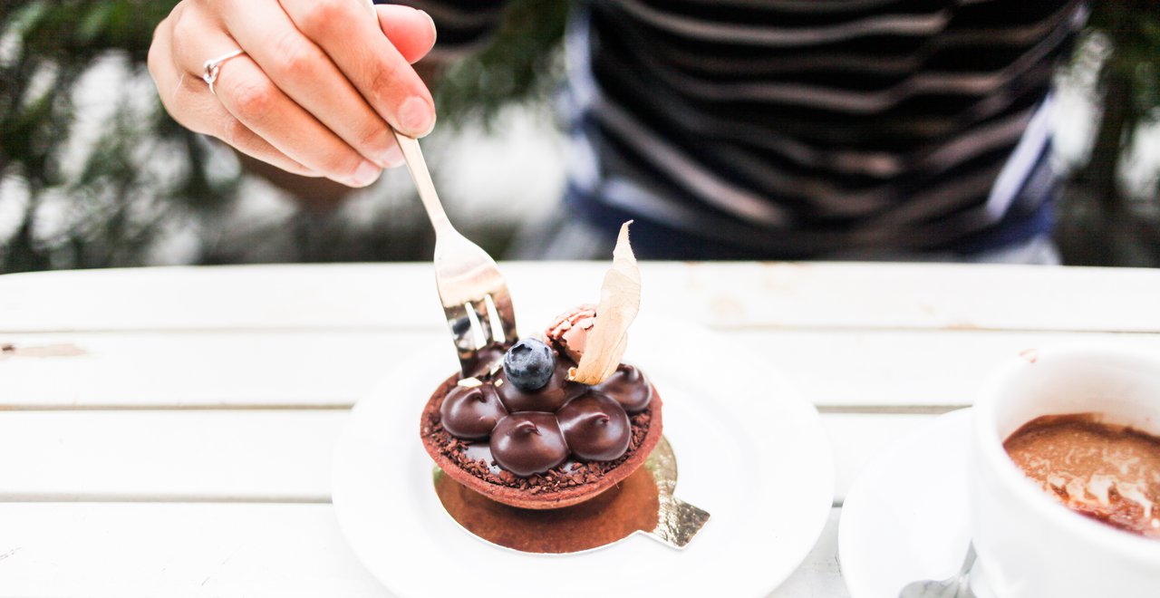 "alt": "A hand, holding a fork, is cutting into a chocolate pastry at Petite France, a bakery at Kungsholmen.",