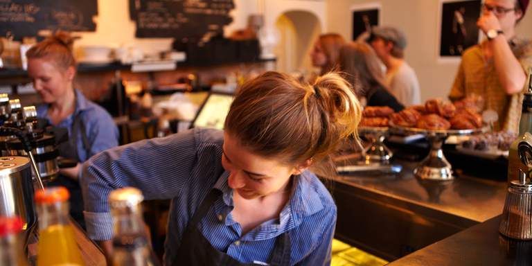 "caption": "Cafés in Stockholm. Lykke Kaffebar on Södermalm, interiör. A barista prepares coffe at Lykke. Cinamon buns a pastries are line up at the counter.",