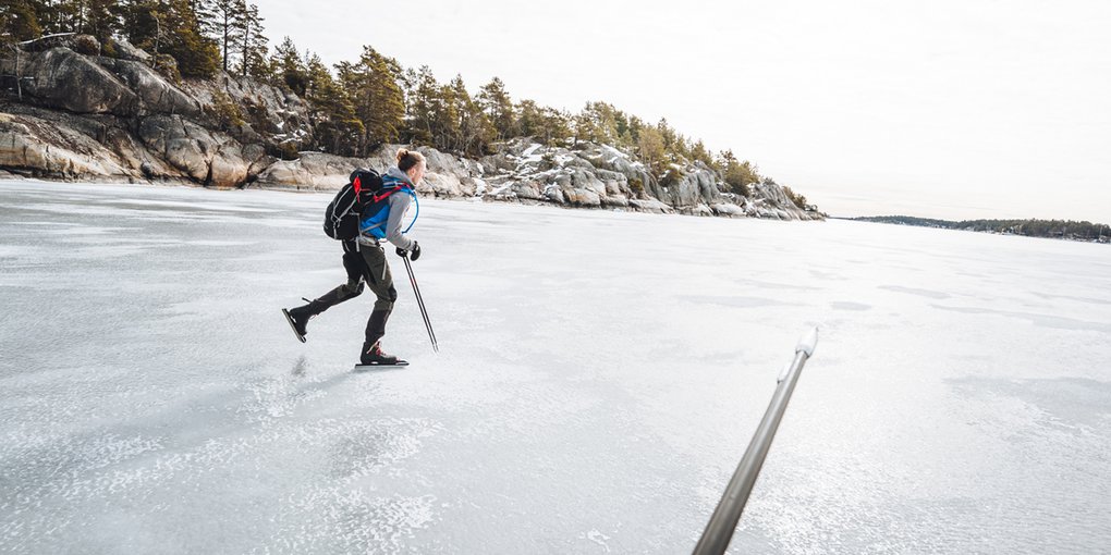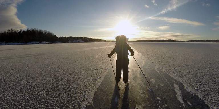 "alt": "Winter in Stockholm, daytime. A person dressed in winter gear is skating along a frozen lake in Stockholm."