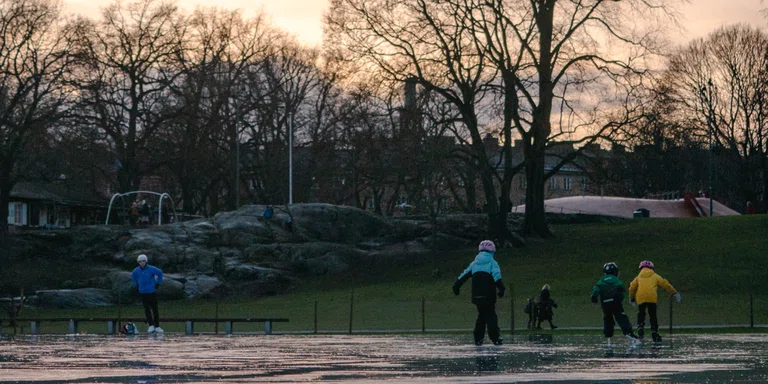 "alt": "Children iceskating in Vasaparken in Stockholm."