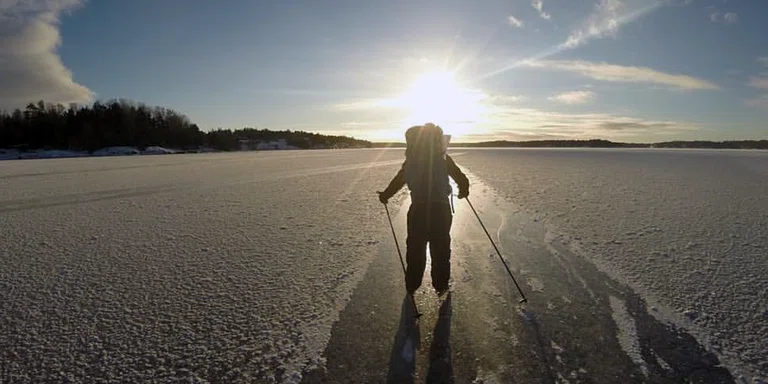 "title": "Winter in Stockholm, daytime. A person dressed in winter gear is skating along a frozen lake in Stockholm.",