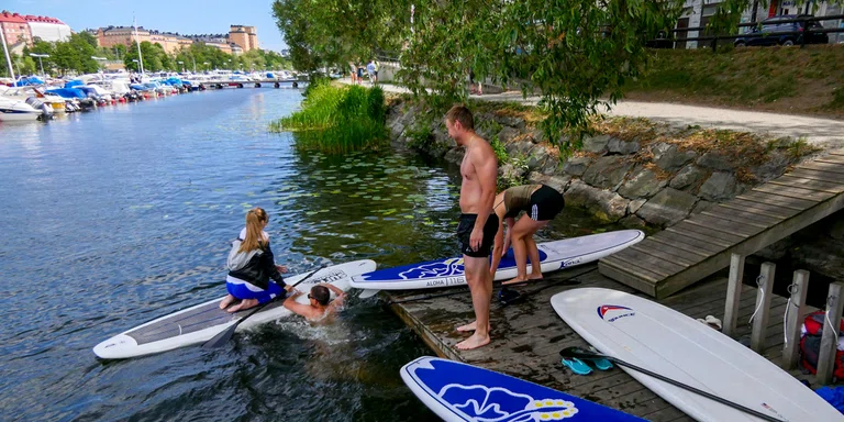 "caption": "Three persons trying out stand up paddleboards with Surfbussen in Stockholm.",