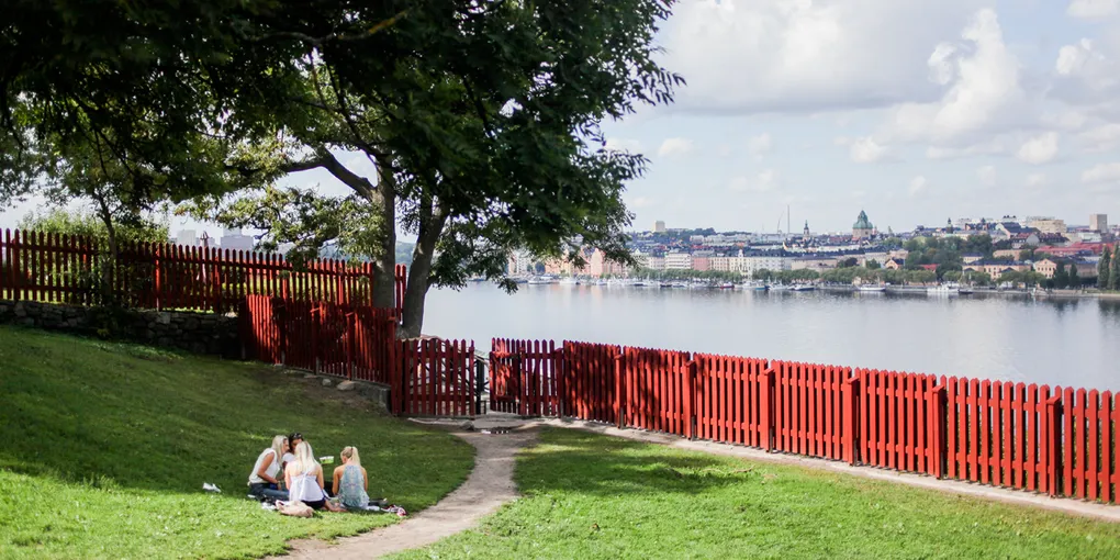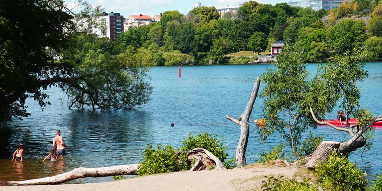 "alt": "Parks in Stockholm. Summer in Stockholm. People are enjoying the warm waters at Långholmen. The sun is shining on a beautiful summer day."