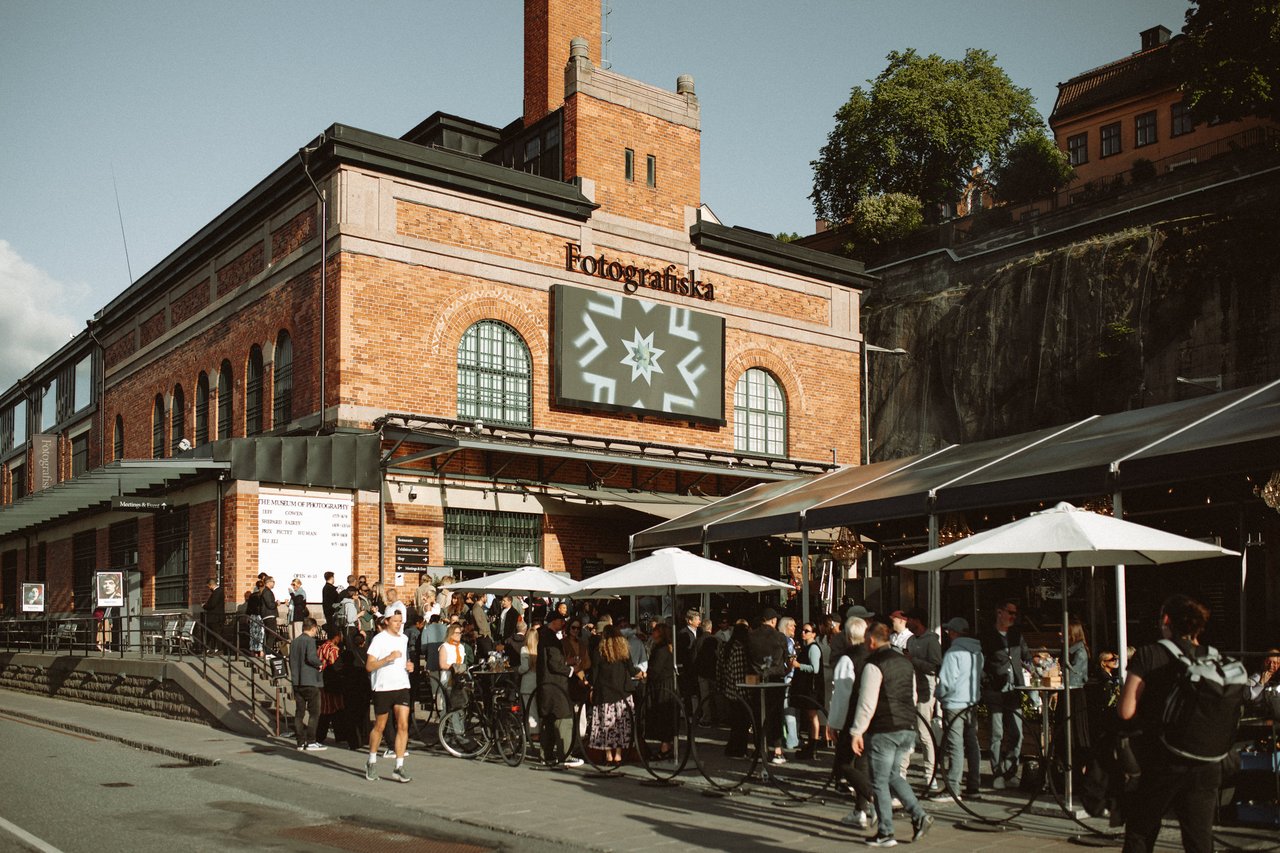 "alt": "The museum for modern photography, Fotografiska in Stockholm. Summer view of the brick building from the outside, with guests crowding on the outdoor terrace.",