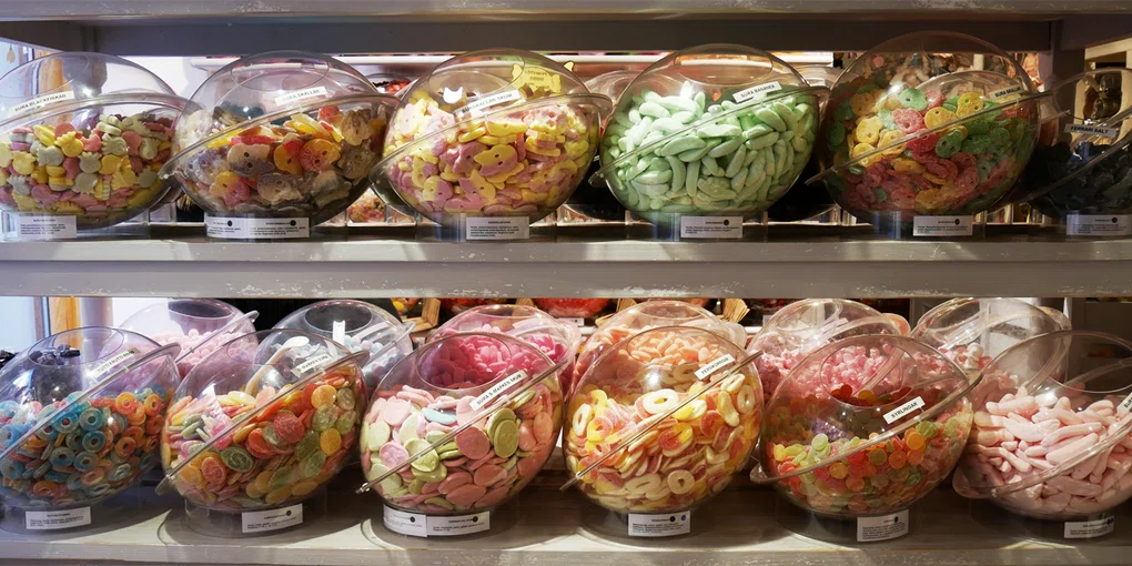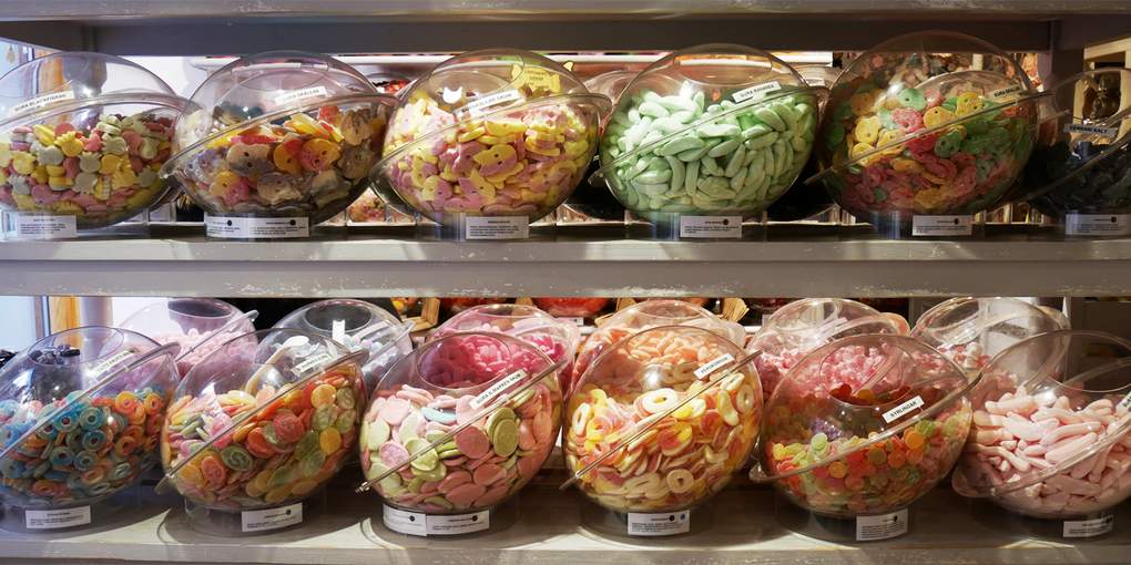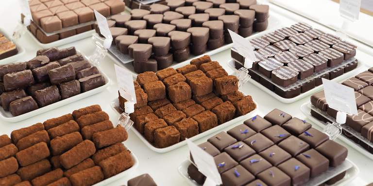 "alt": "Shopping in Stockholm. A display of artisan chocolate pralines at Chokladfabriken.",
