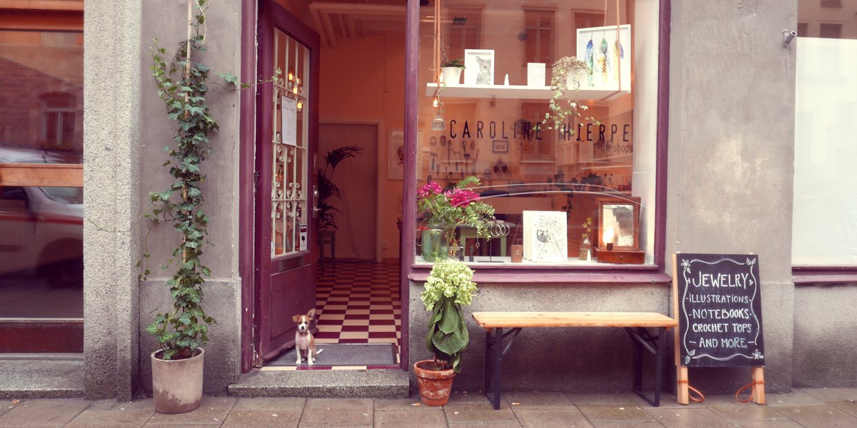 "alt": "Green exterior of the flower shop Christoffers Blommor in Stockholm's Old Town"