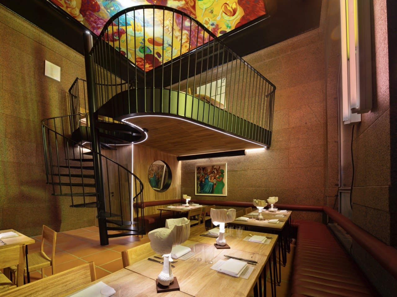 "embeddedTextCaption": "Long tables and chairs by the walls adorned with artwork and illustrations from the museum's archives – retro-futuristic visions of the food and restaurants of the future.",