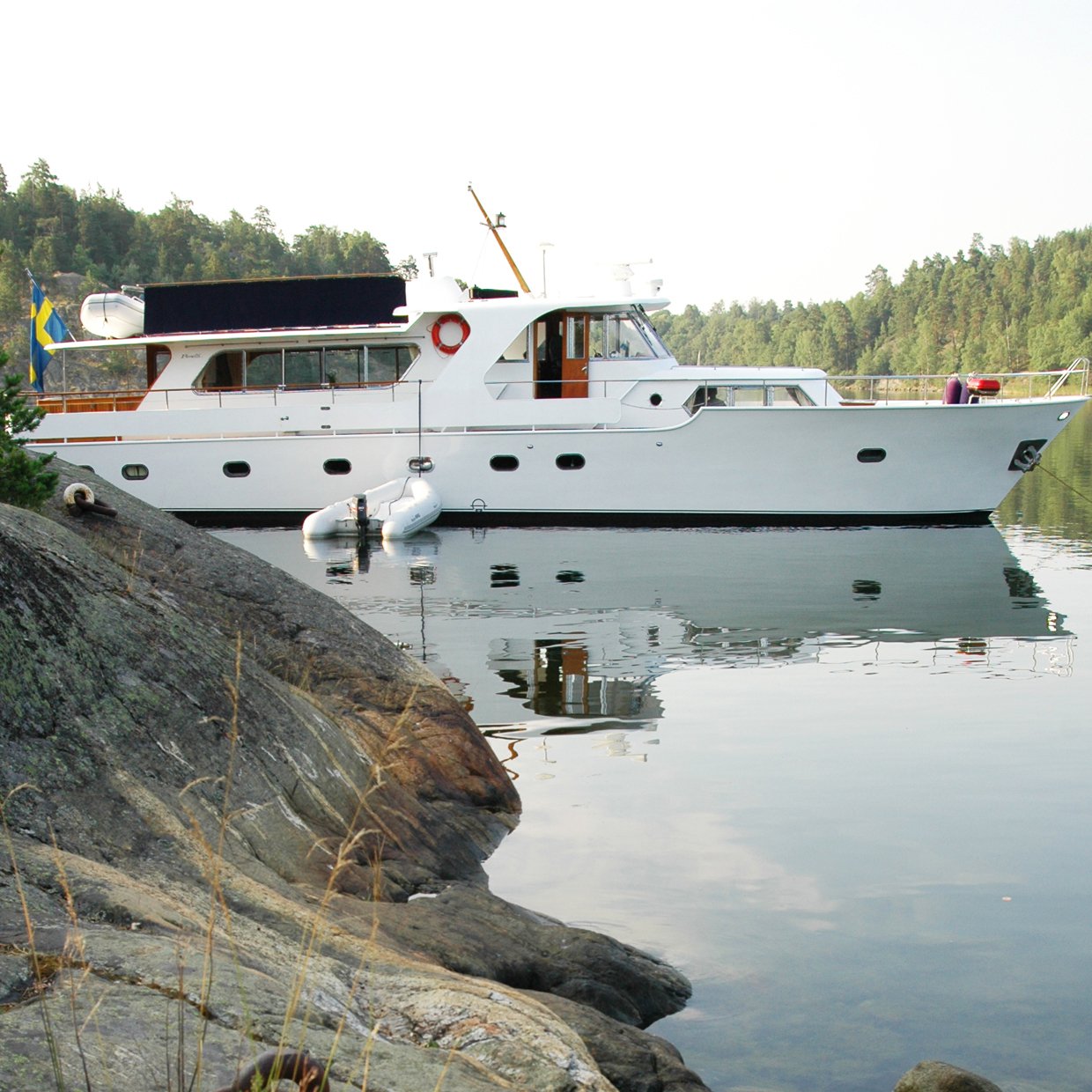 "alt": "Båtturer i Stockholms skärgård. En större yacht står förtöjd i en vik i Skärgården.",