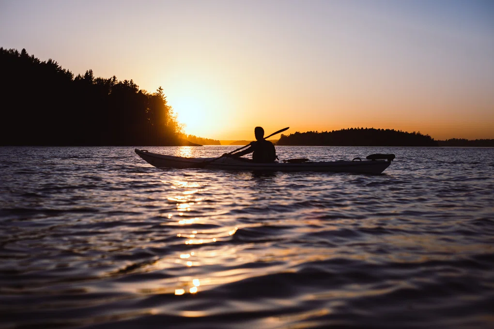 "alt": "Kanotpaddling i skärgården. Sommar, solnedgång. Siluetten av en person som paddlar kanot i skärgården. Himmelen har en vacker ljusorange färg, och den nedåtgående solen speglas på vattenytan.",